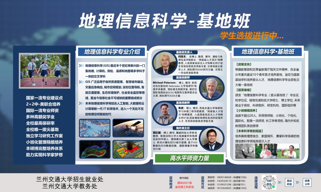 为深入贯彻落实全国教育大会和新时代全国高等学校本科教育工作会议精神,服务国家和甘肃省重大战略需求,引导优秀学生投身基础科学研究,激发学术志趣和内在动力,培养一批国家一流地理信息科学领域拔尖创新人才,兰州交通大学地理信息科学基础学科(国家一流专业建设点)拔尖学生培养基地正式面向2021级全体理工科新生展开招生工作,报名时间为9月15号——9月底,报名方式请查看文末二维码,欢迎同学们积极报名。