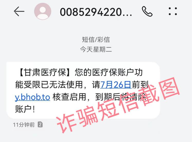 近期,有不法分子利用“您的医疗保账户功能受限已无法使用”等相关题材,向参保人员发送诈骗短信,点开链接后跳转的页面含木马病毒链接,如果按页面上的提示填写身份证号、银行卡号等信息,则可能导致银行卡、医保账户被盗刷。