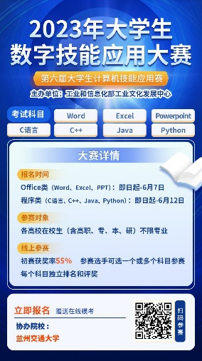 为贯彻习总书记在二十大报告中关于“实施国家文化数字化战略”以及“加快发展数字经济,促进数字经济和实体经济深度融合,打造具有国际竞争力的数字产业集群”等讲话精神,引导青年大学在校生学习掌握各类技能并学以致用,以赛促学,学以致用,增强广大在校大学生的各类技能应用能力,增强学生动手能力的提升及对创新创业人才的培养,提高未来就业竞争力,现组织兰州交通大学学子参加2023大学生数字技能应用大赛暨第六届大学生计算机技能应用赛,相关事宜安排如下: