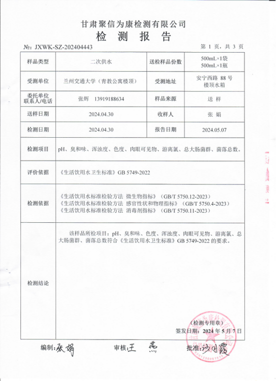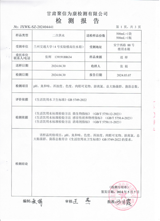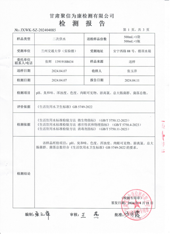 根据安宁区卫生健康局对二次供水设施需定期清洗消毒的规定要求,学校后勤保障部委托兰州泽锐供水服务有限公司于2024年4月6日至4月27日期间,利用双休日分时、分片区停水,并按照行业严格程序对学校大小16个蓄水池(水箱)进行了本年度上半年的清洗消毒工作,清洗后对各水库(水箱)水质进行抽样检验,检验结果均为“样品所检项目:PH、臭和味、色度、浑浊度、肉眼可见物、游离氯、总大肠菌群、菌落总数符合《生活饮用水卫生标准》GB5749-2022的要求”。现对相关清洗及抽样检验结果予以公示。