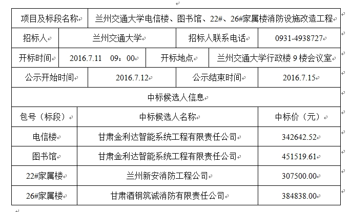 兰州交通大学电信楼、图书馆、22#、26#家属楼消防设施改造工程中标公示