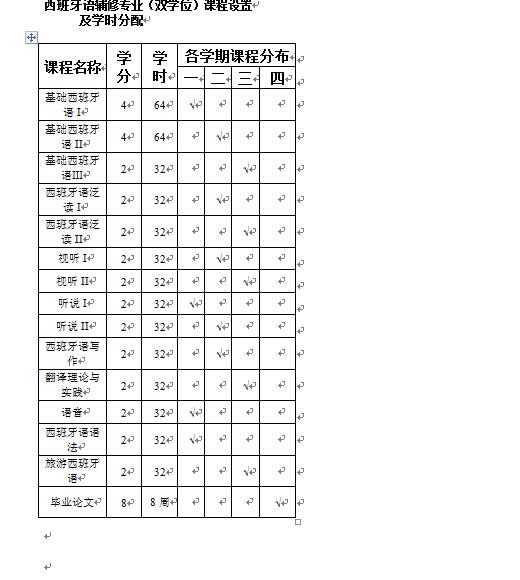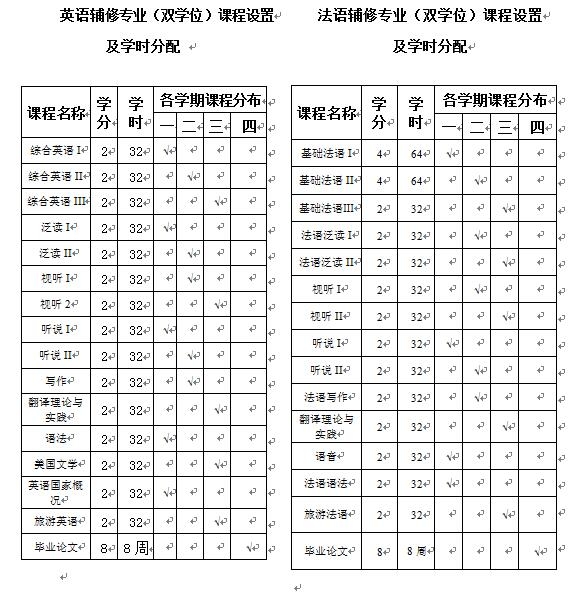 学分:英语38学分;法语40学分;西班牙语40学分。