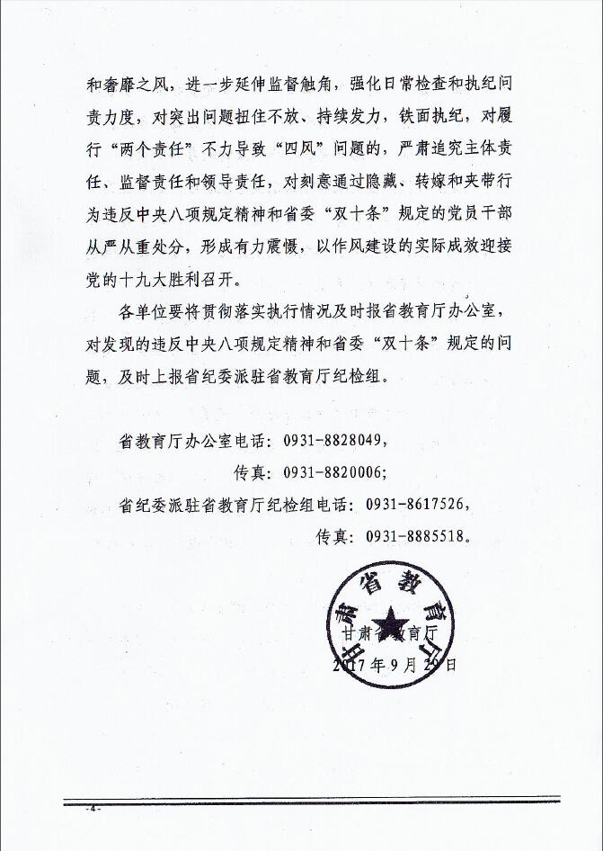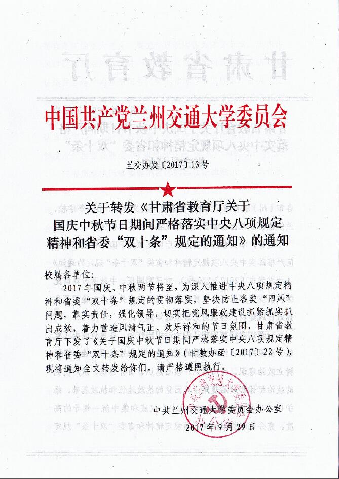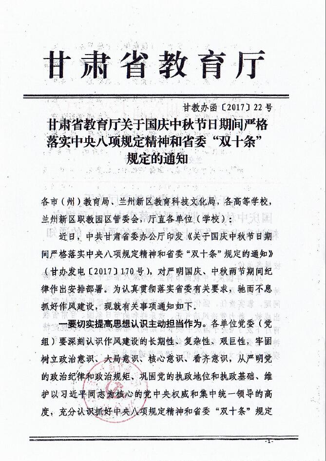 关于转发《甘肃省教育厅关于国庆中秋节日期间严格落实中央八项规定精神和省委“双十条”规定的通知》的通知