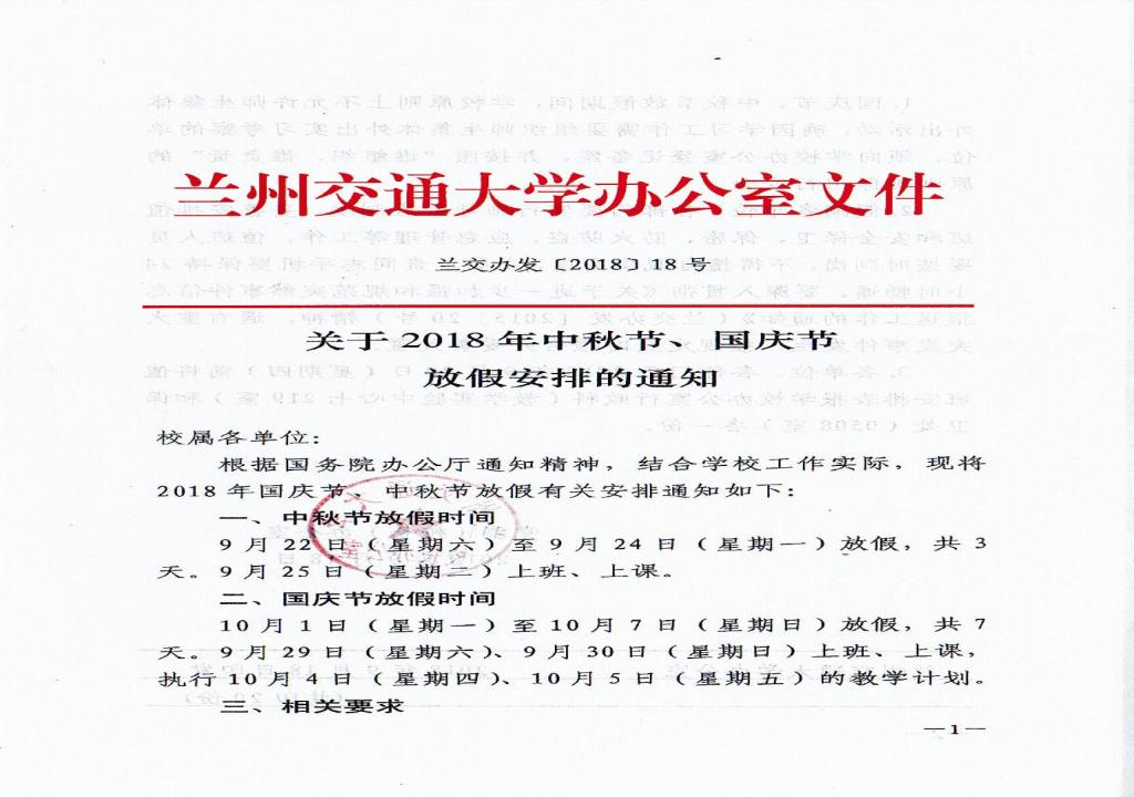 关于2018年中秋节、国庆节放假安排的通知
