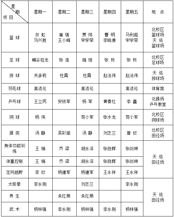 足球、篮球、排球、羽毛球、乒乓球、网球、操类、身体功能训练、体重控制、定向越野与野外生存、太极拳、养生、武术。