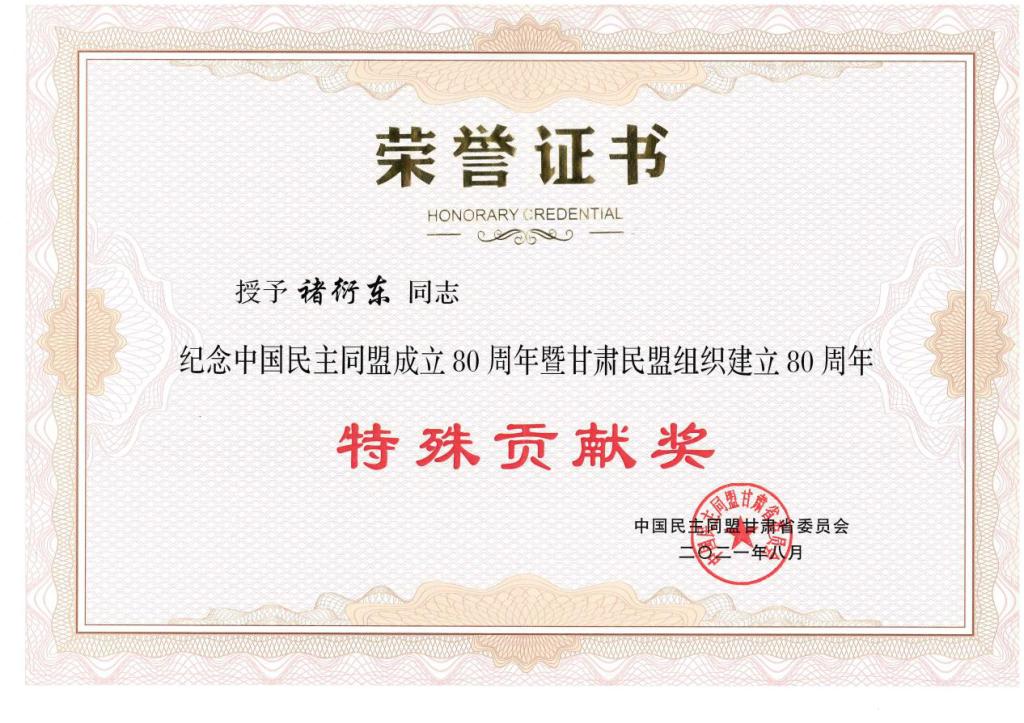 马廷礼代表中共甘肃省委向中国民主同盟成立80周年、甘肃民盟组织建立80周年表示热烈的祝贺,对甘肃民盟过去80年取得的工作成绩给予充分肯定。大会表彰了在盟务工作方面取得突出成绩的集体和个人,我校褚衍东教授等10名同志被授予“特殊贡献奖”荣誉称号,我校民盟委员会主委虞庐松教授等100名同志被授予“突出贡献奖”荣誉称号。