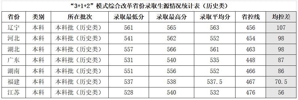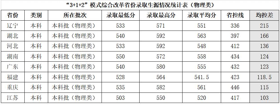 在8个“3+1+2”模式新高考改革省份,无论普通物理类还是普通历史类,我校录取生源质量均有大幅度攀升,物理类录取平均分均超出当地省控线100分以上,历史类录取平均分均超出当地省控线50分以上,具体如下。