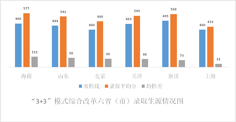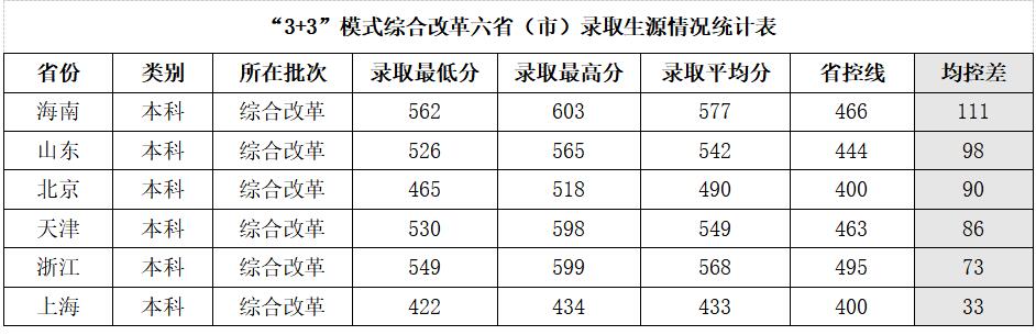 在北京、上海、天津、山东、浙江、海南等6个“3+3”模式新高考改革省份,生源质量稳中有升,除上海外,其他五省(市)录取平均分均高出省控线70分以上,具体如下。