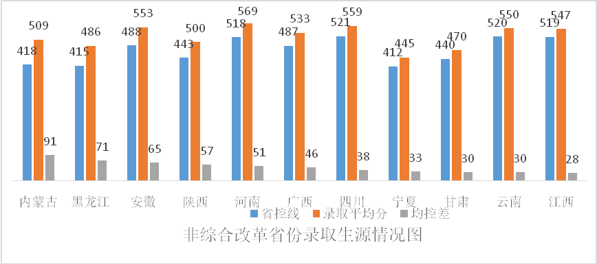 在全国17个非高考改革省份,我校录取情况总体上保持稳定态势,尤其是在12个一本招生省份(其中6个省份全部专业一本招生,6个省份部分优势特色专业一本招生),生源质量持续向好。如内蒙古、黑龙江、安徽、陕西、河南等省份,本科一批(理)批次的录取平均分均高出当地一本省控线50分以上。