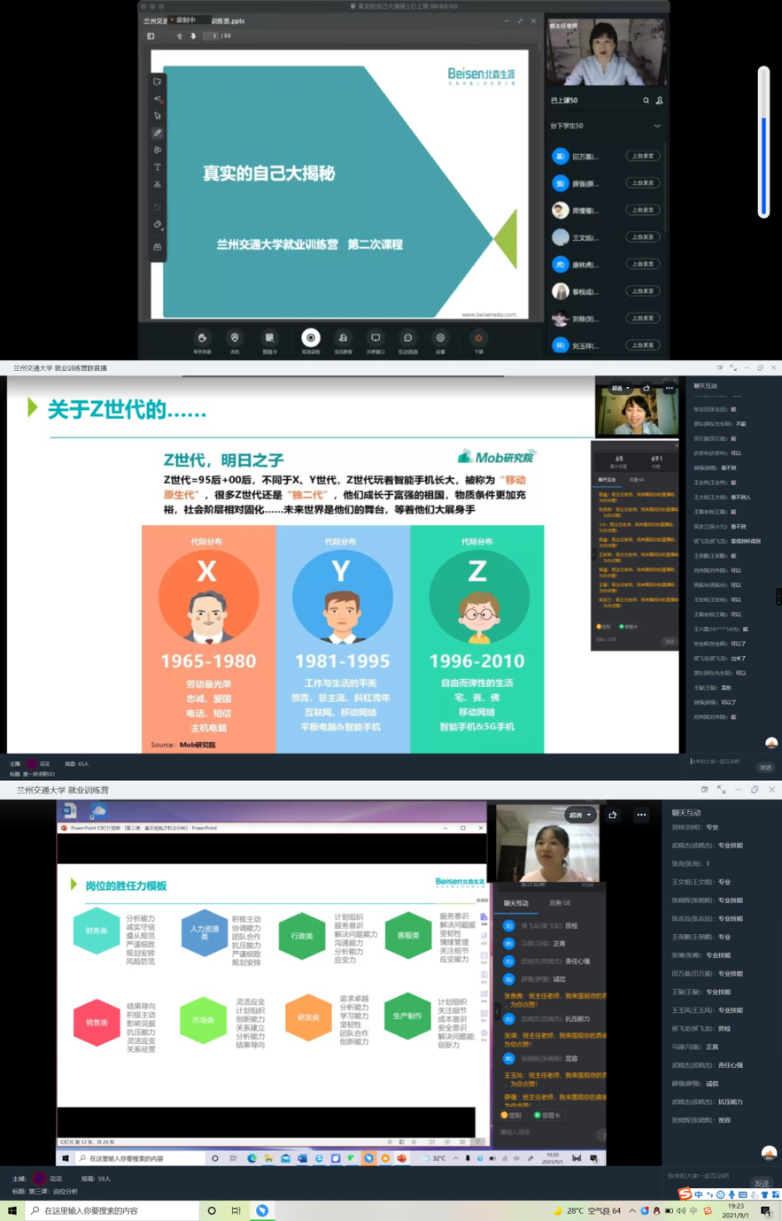 此次毕业生就业专题指导培训课程为期6天,课程内容主要针对求职目标模糊、缺乏自我评估,找不到求职方向;求职屡屡碰壁,对求职产生恐惧心理;求职技巧欠缺,渴望尽快就业。课程形式灵活多样化,内容覆盖全面,有求职启航前的评估与多种就业形势选择、资源取向找机会制作机会清单、分析企业人才招聘及培养新方向、求职材料的制作及网络申请、自我介绍演讲及线上线下面试指导6大板块,授课老师用生动风趣的语言和鲜明的事例,围绕当前大学生的就业现状,择业方向,重点讲解,细致传授,并针对求职过程中的高频问题与同学们进行探讨和梳理,从职场对于新人的需求出发,帮助同学们、特别是就业困难的学生以更加成熟、从容高效的状态应对求职。