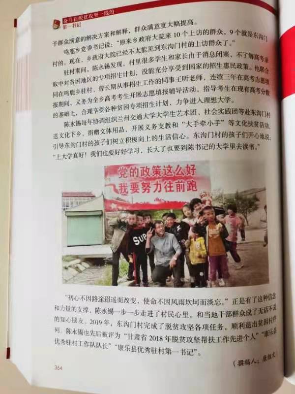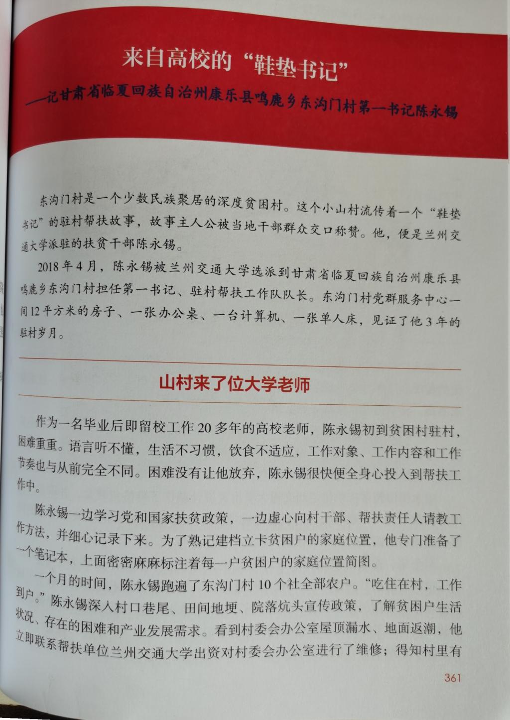 近日,由中国人力资源与社会保障部编辑、中国人事出版社出版的“国家出版基金项目”图书《奋斗在脱贫攻坚一线的第一书记》正式出版发行(ISBN编码:9787512914339)。我校原驻村帮扶干部陈永锡同志的事迹以《来自高校的“鞋垫书记”》为题被收录进该书。