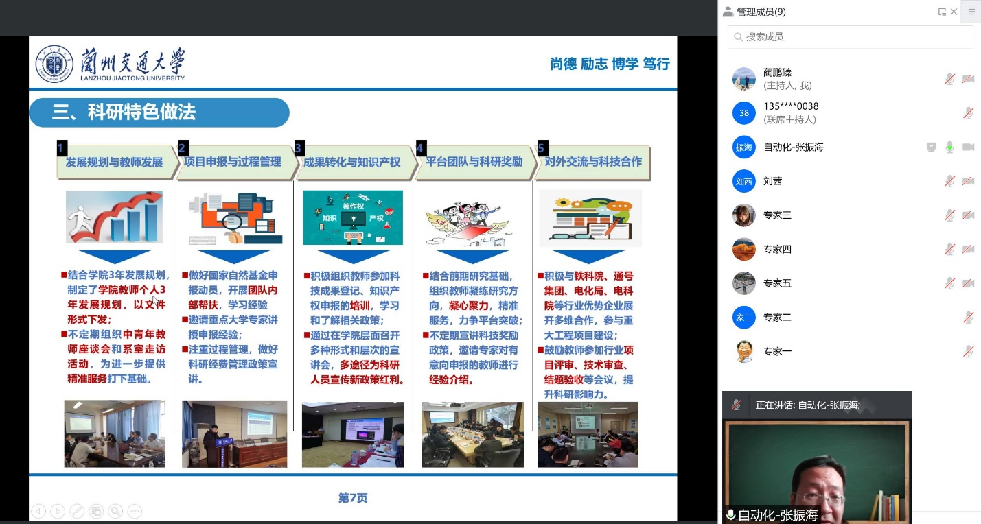 服务不打烊,坚守双岗见实效。对于部分需要专家评审的项目,科技处优化服务举措,采取“线上视频会议”评审,确保疫情条件下各类评审工作公平公正公开。10月24日,科技处组织校内专家进行了国家铁路局运输监管司技术服务项目的校内推荐答辩会议。10月28组织校外专家进行了我校2019-2020年度科研先进集体评审答辩,历时近三个小时,高质量完成此次先进集体的评审工作。