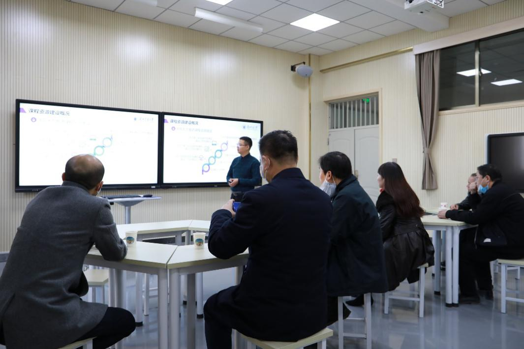 朱廷珺一行先后参观了我院高清录播教室、智慧教室、3D虚拟演播室、多功能互动智慧教室,随后专门听取了我院在线课程资源建设工作汇报。资源建设科工作人员从课程资源建设设施保障、课程资源建设概况、在线学习与管理平台运行、成人函授学生在线学习等四个方面,就课程资源建设与支持服务我校全日制本科生、函授生的工作情况进行汇报。
