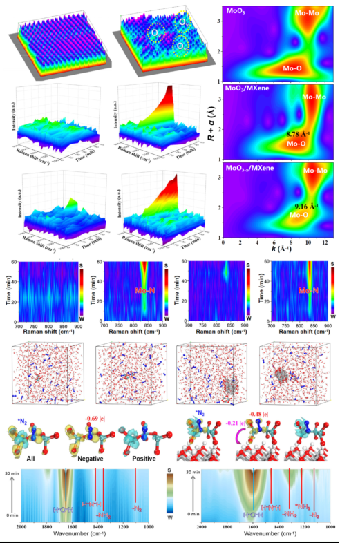 该工作通过构建富氧空位MoO3-x/MXene异质结催化剂,综合利用同步辐射表征、电化学原位光谱分析、分子动力学模拟以及第一性原理计算,深度揭示了氧空位和异质结在电催化氮还原反应过程中的协同作用机理。该工作的研究结果为开发高性能MXene异质结催化剂提供了新的理论基础及实验依据。该项工作得到了国家自然科学基金、中央引导地方科技发展专项资金、甘肃省自然科学基金重点项目、陇原青年创新创业人才等项目的联合资助。