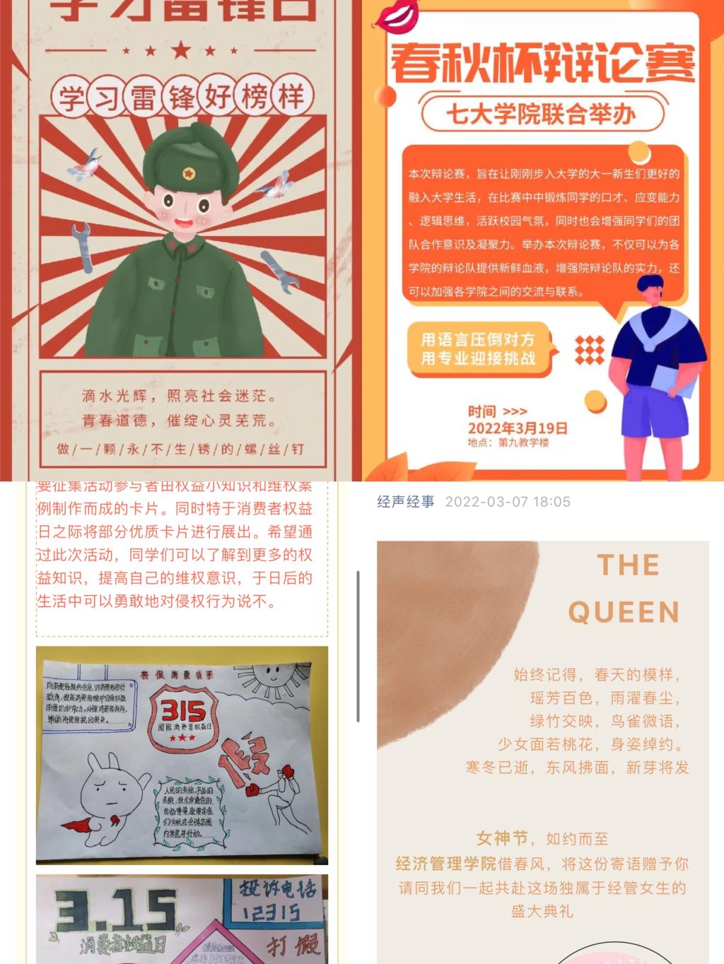 疫情以来,学院及时构筑学生成长“温情线”,嵌入四种做法,聚焦“组织、宣传、落实和成效”等关键环节,把握广度,提升热度,强化力度,打造亮度。一是学院团委以青年志愿者协会为依托,迅速组织征召青年志愿者加入疫情防控工作中,从严从紧落实疫情防控举措,切实履行值守责任,确保不漏一人,“白天到黑夜”全力铸牢疫情防控防火墙,再见经管“志愿红”;二是将校外公寓住宿学生安全“放心间”,开学以来及时安排部署“两点一线”封闭管理,积极发挥学工人员、班主任以及班干部作用,构筑校外疫情防护安全屏障;三是突出重点,精准施策,人文关怀“暖”学子心,疫情以来,学院部署安排及时了解四困学生、隔离学生以及转码学生的学习生活情况,强化疫情流调学生的管理服务与健康监测,按照属地疾控部门和学校要求,有效落实好流调学生管控措施,心理疏导与服务保障工作,对居家监测学生安排专人配送餐食与生活必需品,做好学生的人文关怀;四是线上育人齐发力,积极探索疫情防控期间文化育人新模式,充分利用网络多媒体技术,围绕学生关切点找准脉搏,开展疫情防控倡议、“春秋杯”七院联合辩论赛、“遇见经管遇见你”女神节、“我把我的故事讲给你听”雷锋月演讲比赛等线上活动,丰富疫情管控期间学生日常生活,增强学生活动参与度,丰富学生校园文化建设,以“暖心、贴心、爱心”构筑防疫安全屏障。