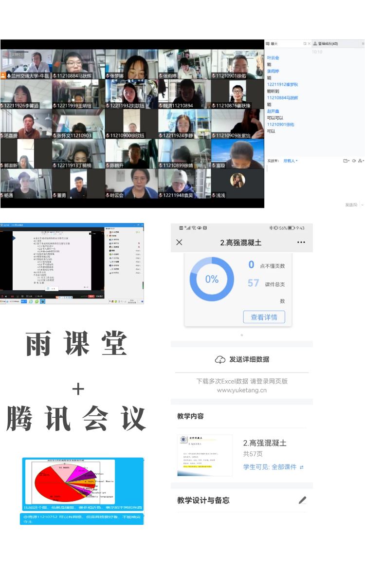 土木学院张粉芹老师在《特种混凝土》线上教学中使用雨课堂+腾讯会议,取得很好的教学效果。课前,张粉芹运用雨课堂发布预习课件,要求研究生完成课前预习;课中,运用雨课堂的弹幕投稿、答题测试功能,同时利用腾讯会议直播功能,加强与研究生线上互动;课后,研究生使用雨课堂课件保存功能,可及时查看教学报告及课件,便于复习与提高。