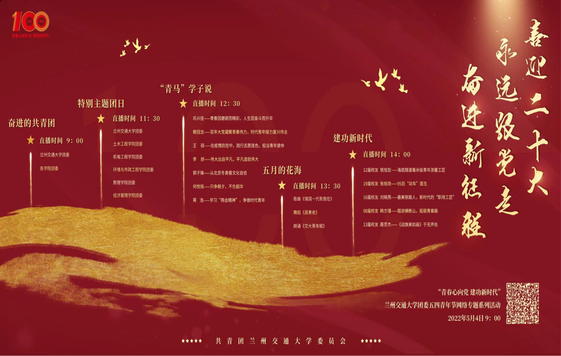 网络直播系列活动。五四青年节当天,共青团兰州交通大学委员会以网络直播方式举办“青春心向党 建功新时代”主题系列活动,通过“奋进的共青团”、“特别主题团日”、“青马”学子说、“五月的花海”、“建功新时代”五个部分持续展播各学院主题活动以及宣传文化产品,为广大团员青年打造了一场特别的青春盛宴。据悉,当天共有1.5万人次在线参与,点赞量达到7.2万次。