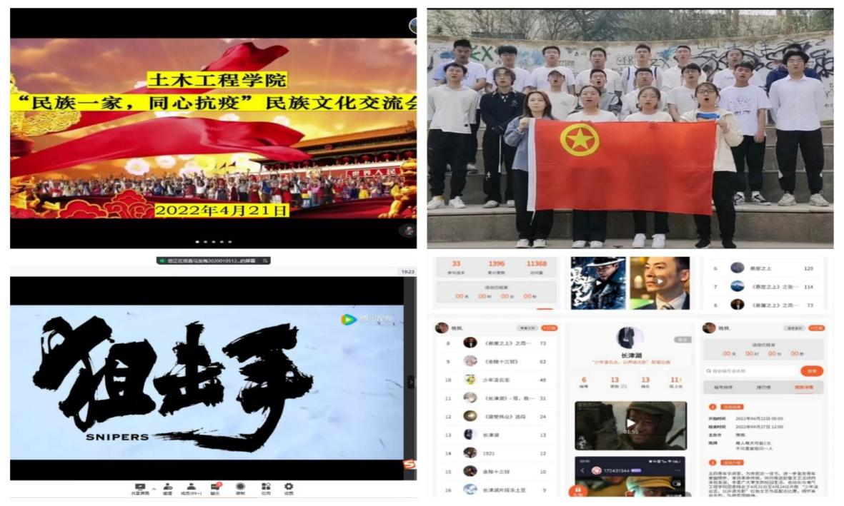 土木工程学院、自动化与电气工程学院、机电工程学院、数理学院、建筑与城市规划学院、外国语学院、艺术设计学院、文学院、生物与制药工程学院积极筹备、认真策划,分别开展了民族文化交流活动、家族族谱制作主题活动、心愿卡主题活动、朗诵活动、歌唱比赛、“绣团旗、绘团徽”活动、观影活动、绘画、海报设计活动、剪纸活动、配音活动、摄影活动。