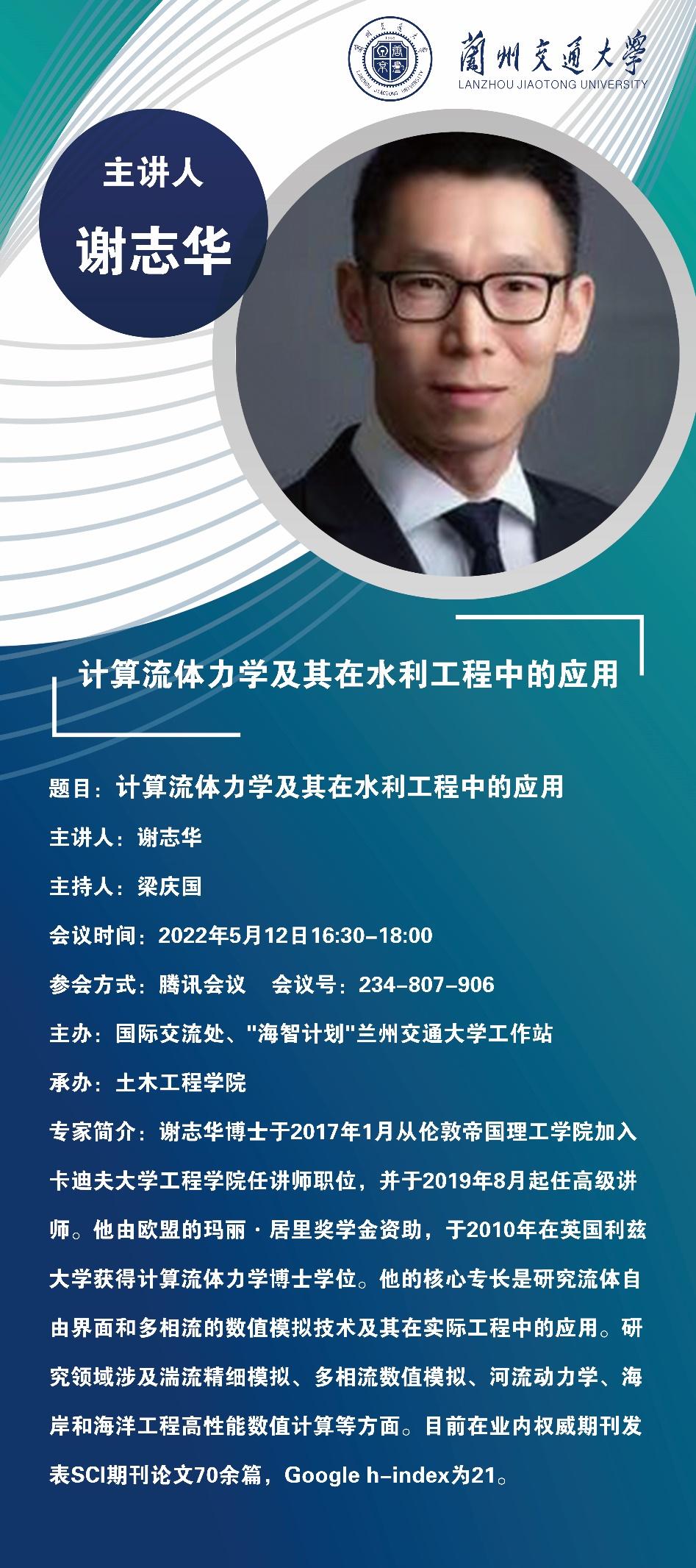5月12日下午,应“海智计划”兰州交通大学工作站和土木工程学院联合邀请,英国卡迪夫大学谢志华博士以线上视频会议方式作了题为“计算流体力学及其在水利工程中的应用”的学术报告。此次讲座为我校“天佑海智云讲堂”系列活动,来自土木工程学院等校内共计200多名师生参加了此次线上学术报告会。
