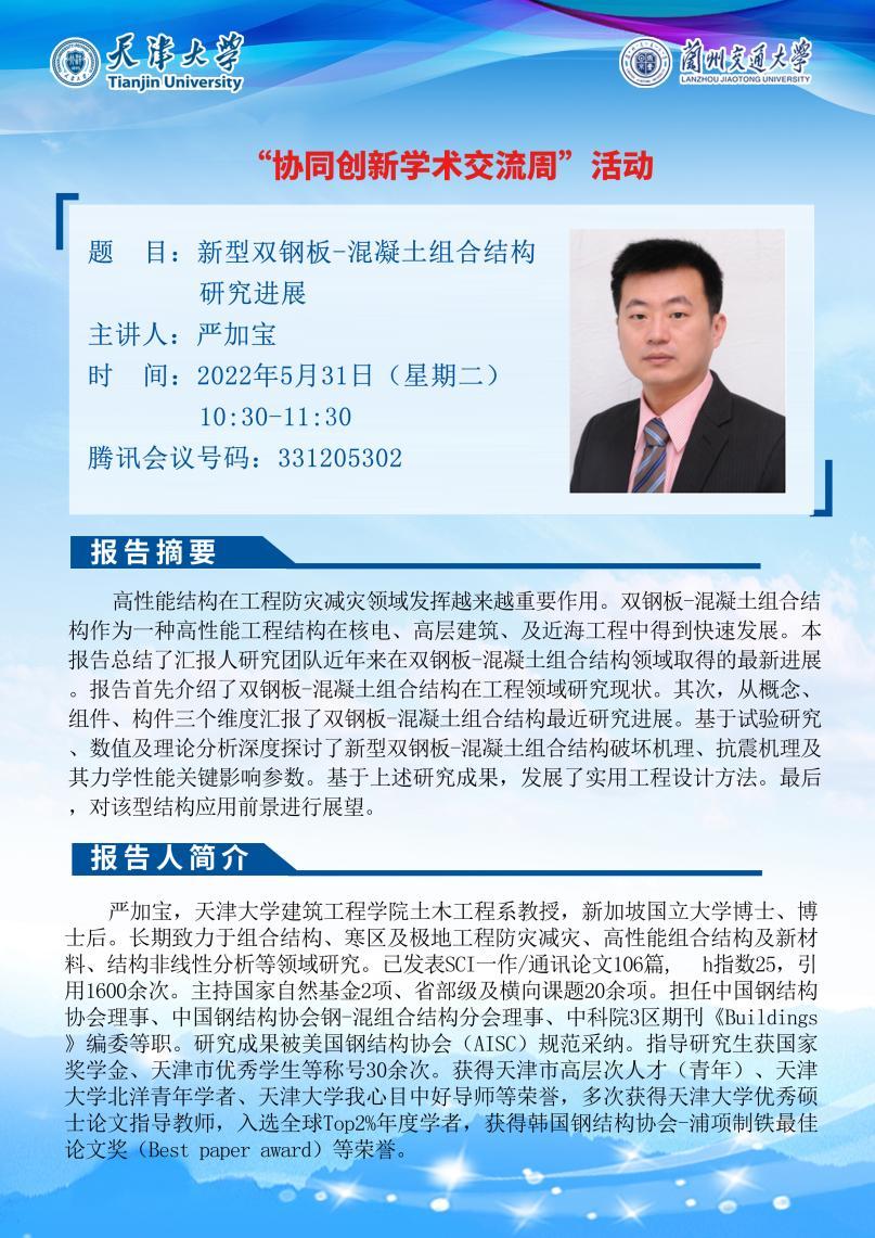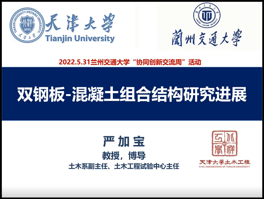 5月31日,土木工程学院邀请天津大学马超教授和严加宝教授为学院师生分别作了《“双碳”目标驱动下的清洁能源系统开发及电能替代效应研究》和《新型双钢板-混凝土组合结构研究进展》的学术报告。报告会为天津大学-兰州交通大学“协同创新学术交流周”活动之一。
