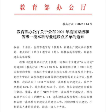 近日,教育部印发《教育部办公厅关于公布2021年度国家级和省级一流本科专业建设点名单的通知》(教高厅函〔2022〕14号),公布了2021年度国家级和省级一流本科专业建设点名单。我校自动化、应用物理学、国际经济与贸易、道路桥梁与渡河工程、化学工程与工艺、环境工程、建筑学、环境设计8个专业获批为国家级一流本科专业建设点。截止目前,我校共获批国家级一流专业建设点27个,占学校招生专业数量的42%。