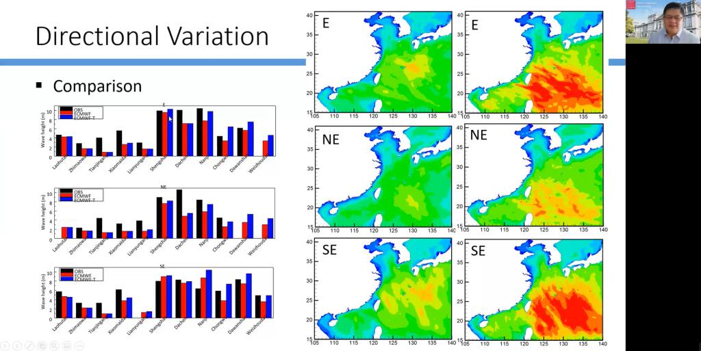 潘顺琪分享了自己在国外的求学和工作经历,讲述了自己的职业发展之路,勉励同学们掌握科学技术,做好人生规划。他介绍了英国卡迪夫大学及其所在的工程学院的情况,介绍了其利用欧洲中期预报中心风场、台风模型以及FVCOM-SWAVE对西北太平洋台风引起的极端波浪和增水研究过程,以英国东部海岸和中国黄河口为例,结合风暴潮、海岸侵蚀、泥沙输运等,向参会师生们讲授了遥感技术和数值模拟的重要作用。