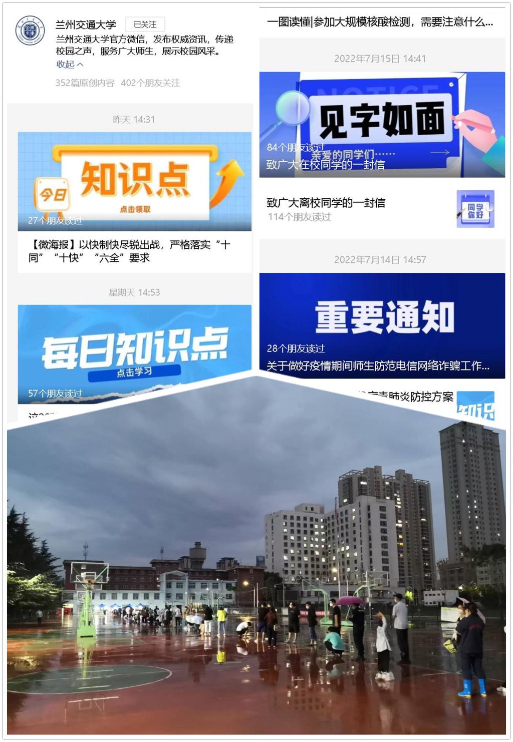 自7月9日校园封闭管理以来,学校利用主页、广播、微信公众号等校园媒体平台,及时向师生推送中央及省委的决策部署、疫情防控知识、学校防控工作等相关报道。学校还通过今日校园、微信、QQ等方式,提醒师生员工严格落实防疫任务、做好个人防护、鉴别抵制谣言,多渠道、全覆盖宣传普及防疫知识,提高师生健康意识和自我防护能力。