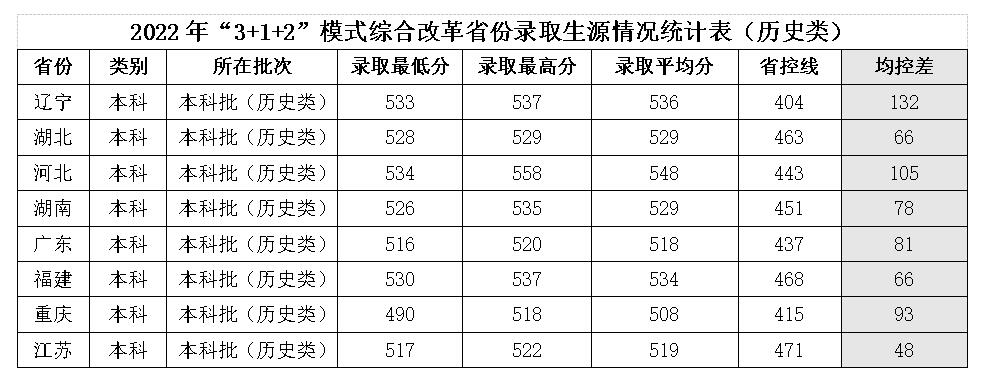 在综合改革省份,今年我校生源质量继续保持稳健态势。在浙江、上海、北京、天津、山东、海南等6个“3+3”新高考改革省份,除上海外,其他五省(市)录取平均分均高出省控线75分以上;在河北、辽宁、江苏、重庆、福建、湖南、湖北、广东等8个“3+1+2”新高考改革省份,物理类录取平均分均超出当地省控线95分以上,历史类录取平均分均超出当地省控线45分以上。(注:均控差=录取平均分-省控线)