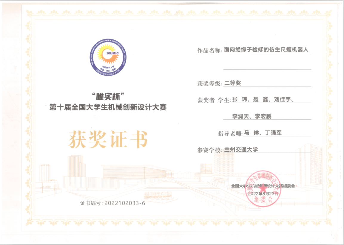 近日,“唯实杯”第十届全国大学生机械创新设计大赛决赛在深圳技术大学落下帷幕,由我校机电工程学院马琳、丁强军老师指导的作品《面向绝缘子检修的仿生尺蠖机械人》荣获全国二等奖。