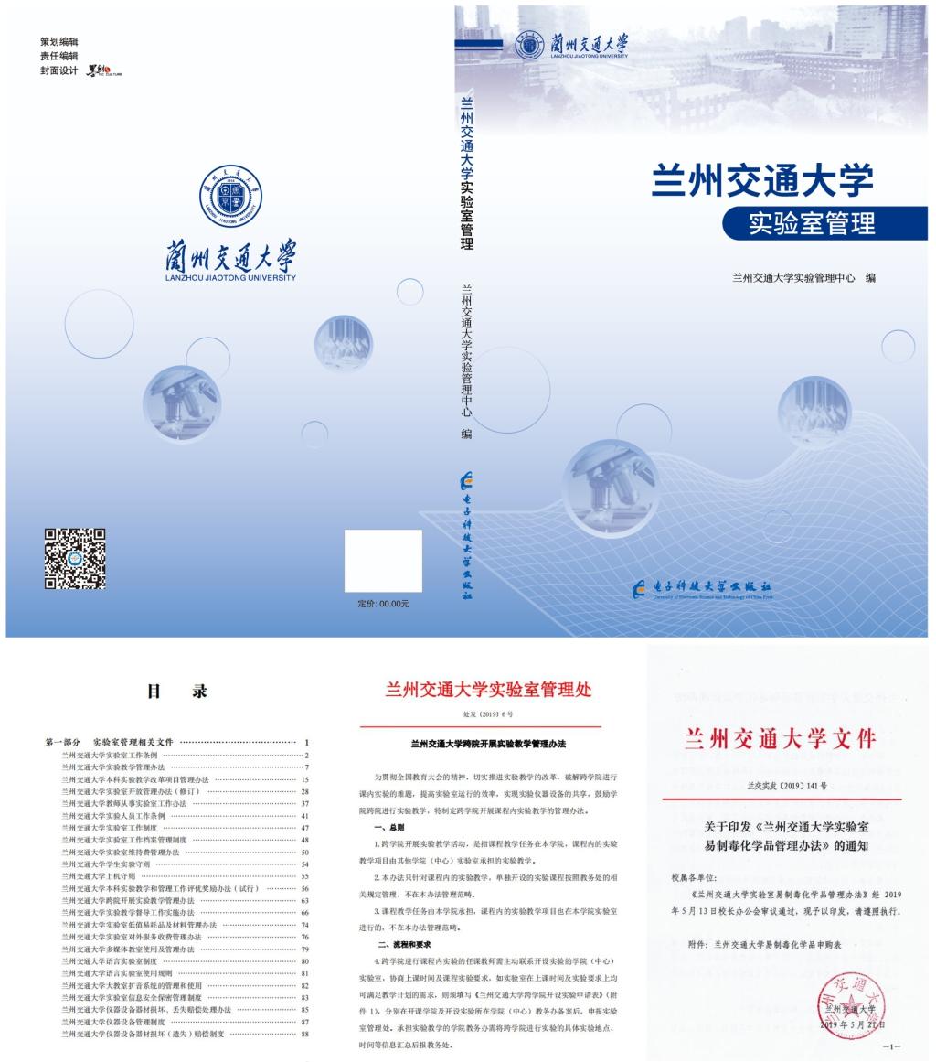 建章立制规范管理,确保建立长效机制。中心认真梳理各类文件,查阅参考了国内外大量的实验室文件资料,将新形势下的实验育人理念融入到实验管理文件中。共制定、修订实验教学、实验管理、实验室建设、实验室安全、实验室维修等文件20余个,基于新的形势与理念对《兰州交通大学实验室工作条例》《兰州交通大学实验教学管理办法》《兰州交通大学实验人员工作条例》等重要实验管理文件作了重大修订,并以兰州交通大学实验管理中心编委会的名义,由电子科技大学出版社正式出版了《兰州交通大学实验室管理》一书,为高校实验室管理工作提供了兰州交大的智慧。例如:为提高实验室运行效率,实现实验室设备的校级共享,制定《兰州交通大学跨学院开展课内实验管理办法》,破解跨学院实施课内实验的难题;制订了《兰州交通大学实验室人员劳保用品发放暂行办法》,保障实验室工作人员的身心健康,更好地为教学、科研工作服务。