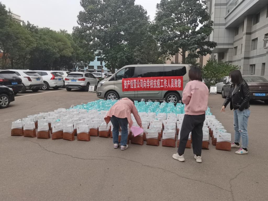 与此同时,资产经营有限责任公司也向校内值守工作人员赠送生活物资,代表校属企业向防疫一线工作人员的辛勤付出表达崇高敬意。副校长贡力带领资产经营有限责任公司负责人及相关工作人员,分别向后勤保障部、党委保卫工作部、学生公寓管理中心等58家单位值守校内的370余名教职工及890余名后勤从业人员送上了一份定制“大礼包”,对他们在防疫期间放弃节假日休息,坚守抗疫一线,守护师生健康平安表示衷心的感谢。