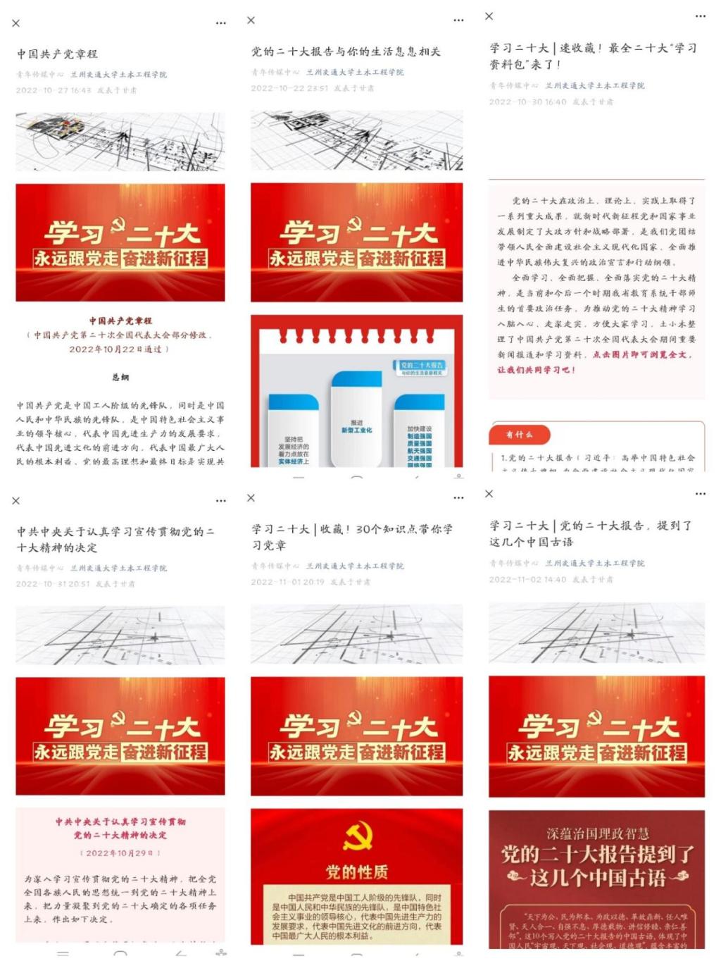 报告精神共享学,将二十大精神写入宣传媒介。学院先后利用新媒体平台发布《二十大召开之际,9图带你了解党代会》《一图速览二十大报告》《“数”读二十大报告》《党的二十大报告学习手册》《9组关键词,感受二十大报告的“民生温度”》《党的二十大与你的生活息息相关》《二十大报告全文来了!》《中共中央关于认真学习宣传贯彻党的二十大精神的决定》《收藏!30个知识点带你学习党章》《党的二十大报告,提到了这几个中国古语》《9个字细读党的二十大报告》等多篇文章,为广大青年学子供给学习内容,有效解决了青年学子学习资料缺乏的问题。