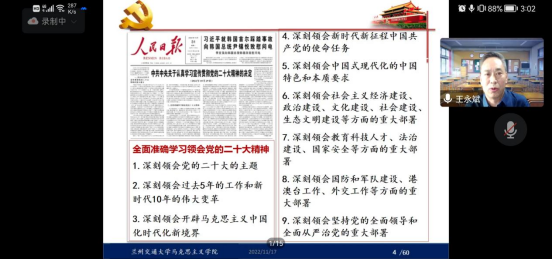 最后,学院党委负责人进行了总结。他强调,这次的二十大报告,为我们党和国家明确了奋斗目标,指明了奋斗方向。大家要以高度的政治自觉,充分利用各种学习平台和渠道来开展学习,内化于心,外化于行。特别是对校党委提出的四个方面下功夫上,要深刻理解领会,并落实到疫情防控,教育教学,科学研究和就业指导等工作中去,切实推动文学院各项工作的进步与发展。同时还要求大家绷紧疫情防控这根弦不放松,特别是党员要带头落实好各项防疫政策,“一个支部就是一个堡垒,一名党员就是一面旗帜。”要充分发挥党支部战斗堡垒作用和党员先锋示范作用,坚决打赢此次疫情防控攻坚战。