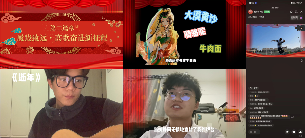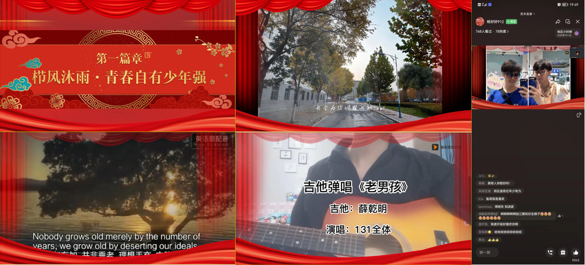 晚会在歌曲《如愿》中拉开序幕,表达了对祖国的祝福以及对新时代美好生活的期盼;舞蹈《After like》激情澎湃,活力的舞姿伴随着动感的音符舞出青春的时代风范,瞬间点燃了观众的激情;诙谐幽默的微视频《甘肃风光》通过独特视角,让大家品味到了甘肃传统文化之美,风趣的解说将场内气氛推向高潮;铿锵有力的朗诵《相信未来》,表演者用雄浑厚重的声音,展示出在逆境中,怎样好好地生活,怎样自我鼓励,怎样矢志不渝地恪守自己对明天的承诺,抒发了一代青年学子对党和国家的热爱,以异乎寻常的坚定和执着告诉我们:相信未来,热爱生命。