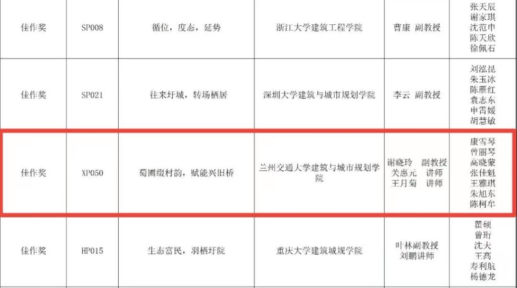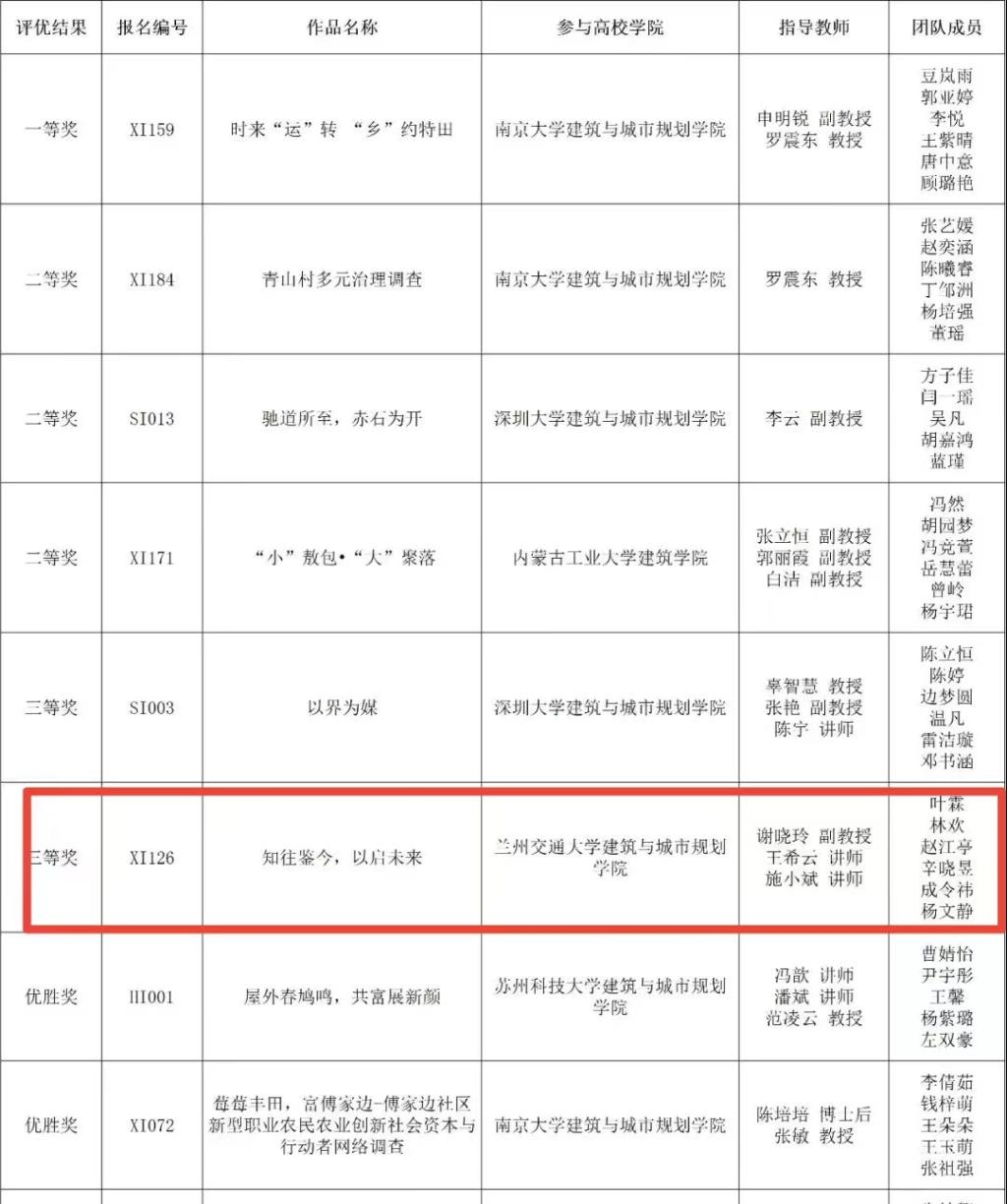 近日,由中国城市规划学会乡村规划与建设学术委员会主办的2022年度全国高等院校大学生乡村规划方案竞赛落下帷幕。竞赛从8月份启动,历时4个月,经过激烈角逐,由我校建筑与城市规划学院谢晓玲、王希云、施小斌三位老师指导,学生叶霖、林欢、赵江亭、辛晓昱、成令祎、杨文静组队完成的作品《知往鉴今,以启未来》在“乡村调研报告单元”中获得三等奖;由谢晓玲、关惠元、王月菊三位老师指导,学生康雪琴、曾丽琴、高晓蒙、张佳魁、王雅琪、朱旭东、陈柯牟组队完成的作品《萄圃缀村韵,赋能兴旧桥》在“村庄规划方案单元”中获得佳作奖。