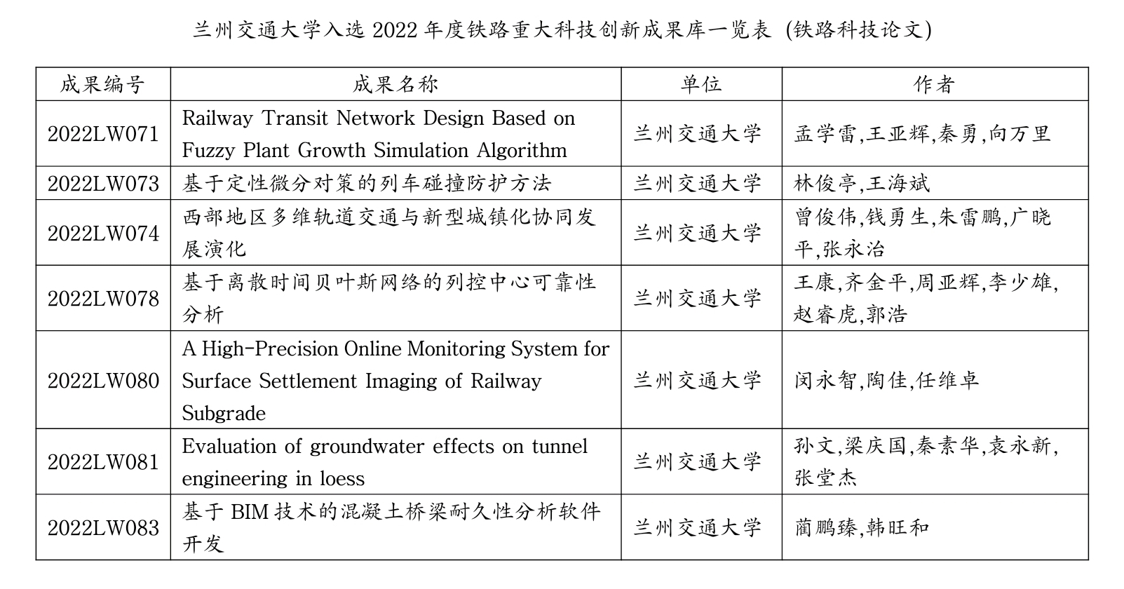 近日,国家铁路局发布了《关于公布铁路重大科技创新成果库2022年度入库成果的通知》,我校共有7项铁路科技论文成果入选重大科技创新成果库。