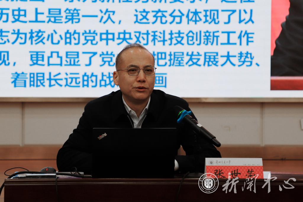 张世荣紧密围绕党的二十大报告对科技创新的新摆位新部署和习近平总书记关于科技创新的重要论述,深入分析了我省科技创新的优势现状问题,详细介绍了甘肃省第十四次党代会、省委十四届二次全会对“强科技”行动的部署,并从“提升科技创新创造力、提升科技支撑重点产业发展能力、提升科技人才创新能力、提升科技成果转移转化效力、激发科技创新活力”等五个方面对《甘肃省强科技行动实施方案(2022-2025年)》进行了深入解读,对我校今后的科研工作开展有很大的启发、很强的指导与帮助。