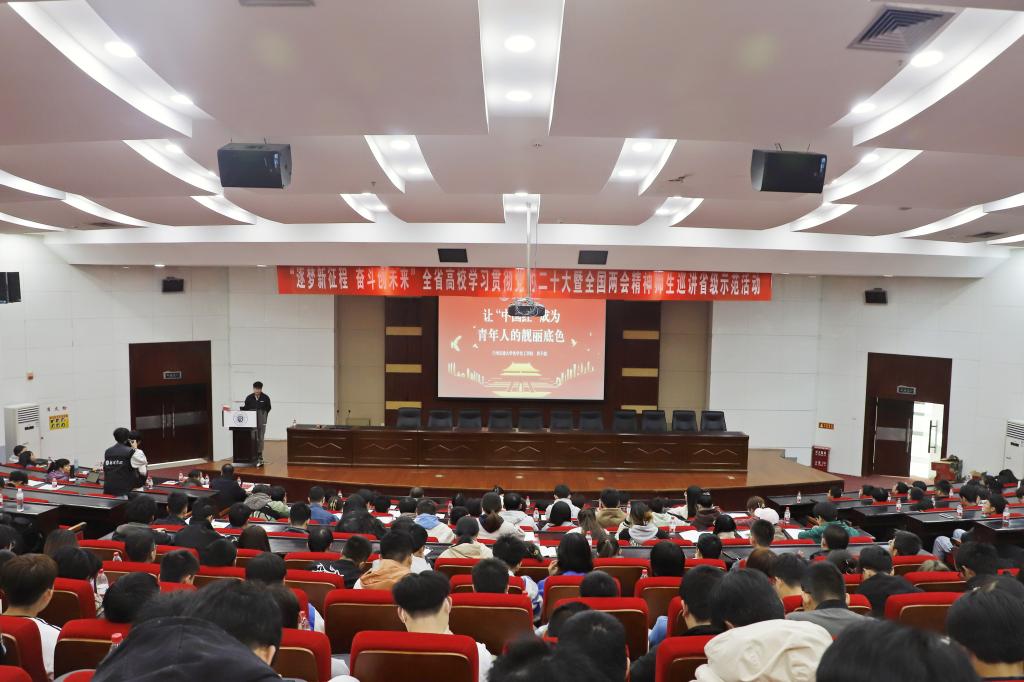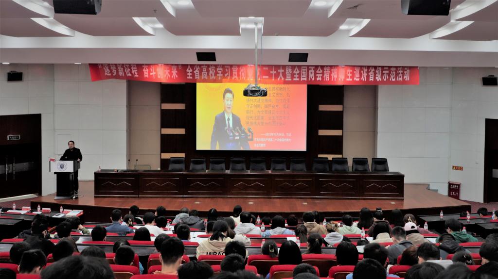 4月6日下午,在学校尚德楼三楼大报告厅,“逐梦新征程 奋斗创未来”全省高校学习贯彻党的二十大暨全国两会精神巡讲省级示范活动第五巡讲团成员为300多名“青马工程宣讲团”成员和团学干部进行理论宣讲。