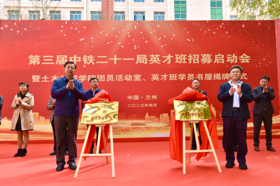 4月11日下午,中铁二十一局第三届英才班招募启动会暨土木工程学院团员活动室、英才班学员书屋揭牌仪式在北苑四号楼前广场举行。兰州交通大学副校长马军党,我校杰出校友、全国工程勘察设计大师汤友富出席,中国铁建党委组织部(人力资源部)、人才处,中铁二十一局人力资源部,学校招生就业处、公寓管理中心、土木工程学院相关负责人,第二届英才班学员、学校师生共200余人参加揭牌仪式。会议由招生就业处负责人主持。