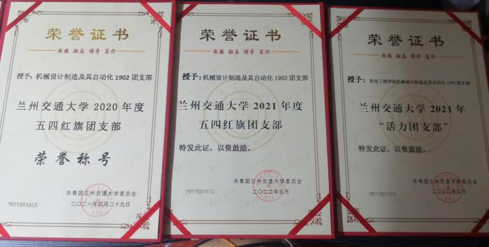 机械设计制造及其自动化1902团支部自成立以来,以“不忘初心、牢记使命”为信念,以组织建设促进思想建设、组织建设助力活动开展、组织建设推动发展规划为支部建设方向,致力于将支部打造成为“班子建设好、团员管理好,活动开展好、制度落实好、作用发挥好”五好团支部。团支部严格落实“三会两制一课”,规范开展团员发展和推优入党;以团干部领学、团员自学、团支部学习研讨等形式扎实开展组织化学习。支部成员参加“青年大学习”网上主题团课达到100%全覆盖。支部秉承着“尚德、励志、博学、笃行”的校训,积极开展主题团日、打造“一支部一项目”活力提升工程、组织开展支部温馨活动,多措并举引导支部成员“以青春之我、奋斗之我,书写青春年华”。支部先后荣获兰州交通大学2020年度、2021年度“五四红旗团支部”和兰州交通大学2021年度“活力团支部”。