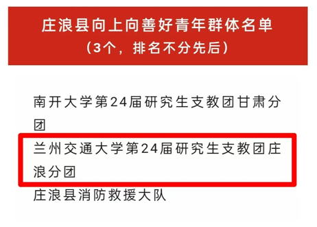 庄浪县委宣传部、团县委授予我校第24届研究生支教团庄浪分团“向上向善好青年群体”荣誉称号。