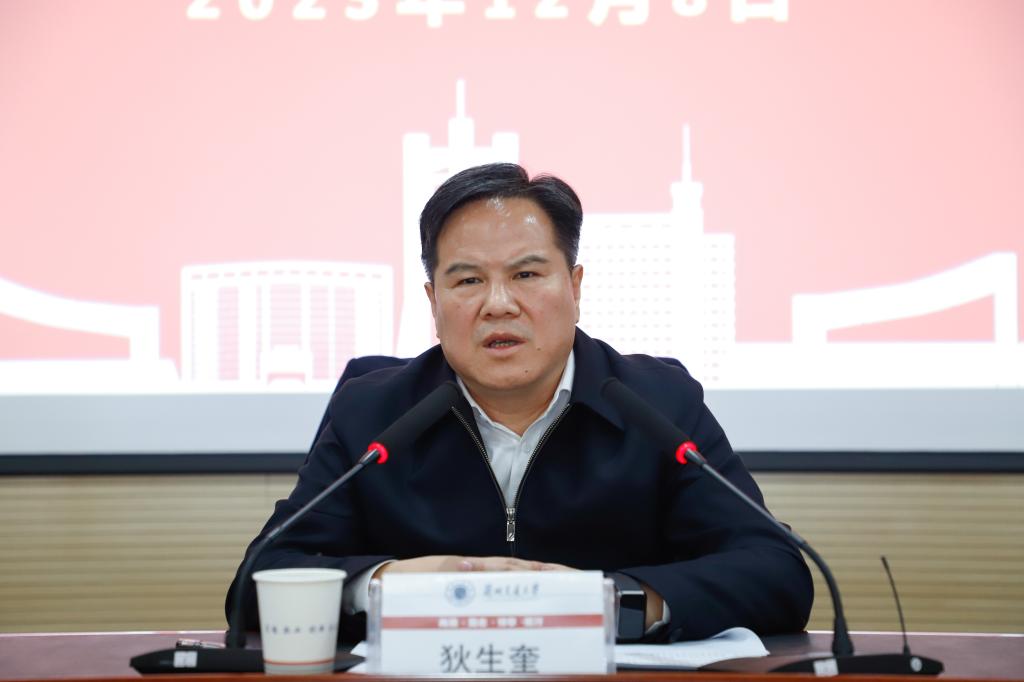 狄生奎在讲话中肯定了三位同志的表态发言,强调了机电工程学院的建设发展对学校乃至轨道交通行业的重要性,结合学校“1152”发展目标,对学院工作提出了五点希望和要求:一是加强学习,筑牢思想之基。坚持以习近平新时代中国特色社会主义思想为指引的办学办院方向,落实立德树人根本任务,推进全员全过程全方位育人,解决好培养什么人、怎样培养人、为谁培养人的根本问题。二是加强谋划,引领发展。领导班子要谋划蓝图,以交通运输工程国家一流学科建设为突破口,为轨道交通行业持续贡献优秀人才和科技成果,将机电工程学院建成行业特色鲜明、具有影响力的学院。三是加强落实,推动发展。将落实学校“1152”目标任务作为奋斗目标,分解目标、咬定目标、实现目标,调动全力,推动落实,做到五个新提升。四是加强团结,合力发展。坚持民主集中制,凝聚集体智慧,充分调动和发挥全院教职工的积极性,强化协同创新,形成欣欣向荣的发展局面。五是加强自律,平安发展。建立安全、和谐、稳定的发展机制,在意识形态、师德师风等方面始终保持风清气正的发展环境。为把学校建设成为地域特色鲜明、行业影响力突出、拥有若干国内一流学科的高水平大学作出机电工程学院应有的贡献。