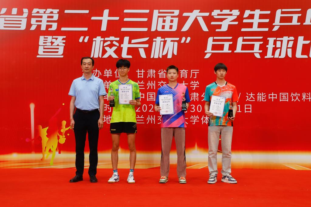 学生甲组男子单打第一名兰州大学张子豪、第二名兰州工业学院许伟东、第三名甘肃政法大学马东璇。