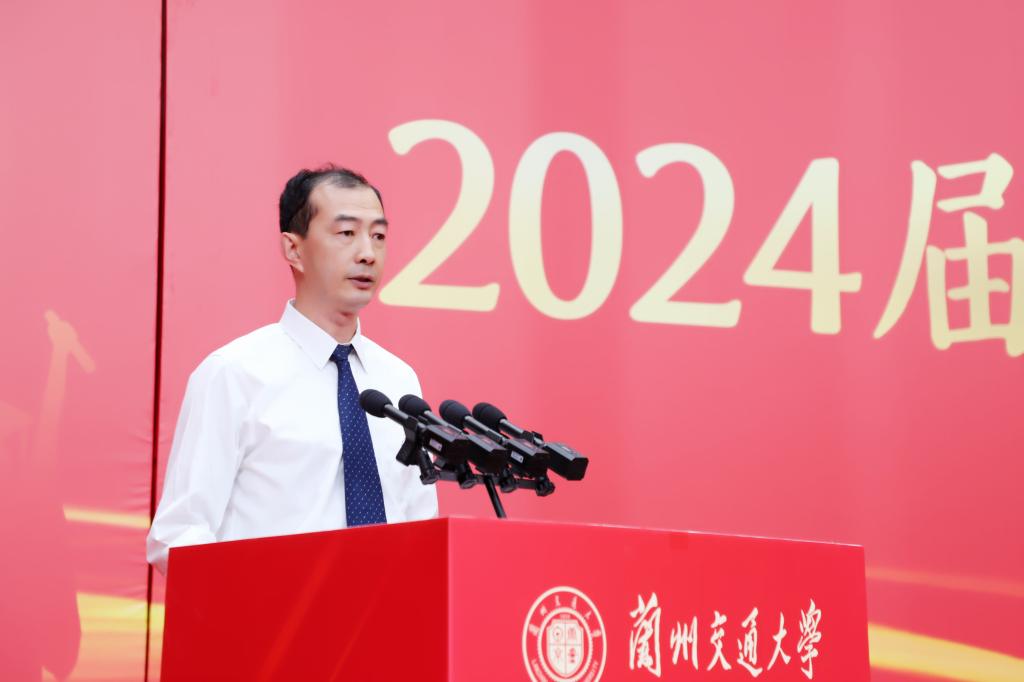 狄生奎代表学校向毕业生们送上热烈的祝贺和美好的祝福,并作题为《以青春之名 赴时代之约》的讲话。他表示,求学时光镌刻了同学们不平凡的青春印记,学校见证了同学们从青涩懵懂到坚定自信,看到了大家在青春赛道上奋力奔跑的模样,看到了新时代兰州交大学子的责任与担当。同学们也见证了学校的快速发展,见证了学校坚定地走出了一条以轨道交通为核心的特色办学之路。在新征程上,学校将主动融入教育强国、交通强国战略,推动教育、科技、人才协同发展,积极培育新质生产力,赋能高质量发展。