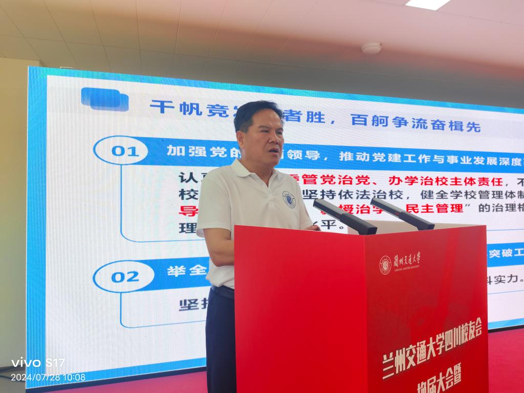 狄生奎代表学校作了热情洋溢的致辞。他首先向四川校友会换届大会的成功召开表示热烈的祝贺,向长期以来情系母校、关心母校、支持母校建设与发展的广大校友表示衷心的感谢。他指出,兰州交通大学传承京唐,扎根西北,立足甘肃,面向全国,充分发挥轨道交通行业特色优势,多年来在人才培养、学科建设、科研创新、服务社会等各领域取得的丰硕成果。这些成绩的取得离不开全体兰州交大人的默默坚守和辛勤付出,更离不开广大校友的深情关怀和鼎力相助。在新的征程上,学校正锚定“1152”奋斗目标,充分发挥行业优势特色,努力巩固“铁路工程师摇篮”的地位,紧盯行业技术革新和发展前沿,全面深化校地校企合作,以更加开放和主动的姿态,积极融入中国式现代化建设,为交通强国、教育强国和甘肃科教兴省战略实施而奋力拼搏。希望广大校友能够一如既往的关心和支持母校的改革发展,凝心聚力,发挥优势,开拓奋进,再创辉煌。