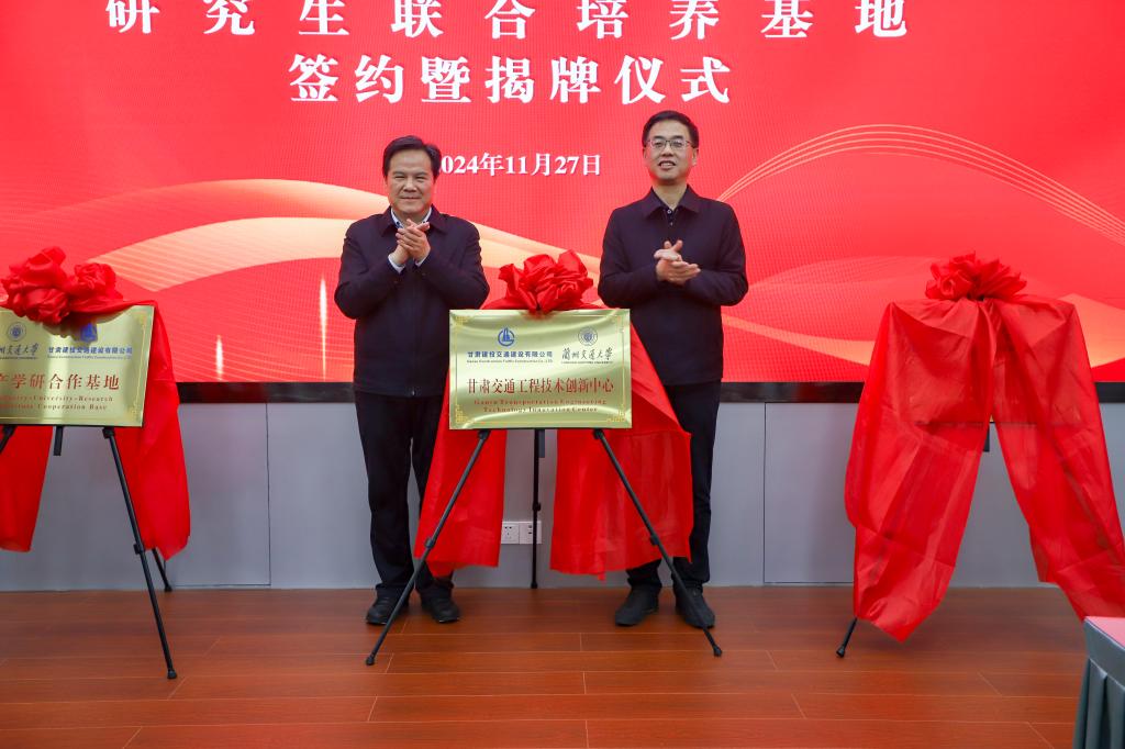 在热烈的掌声中,马明、狄生奎为产学研合作基地、甘肃交通工程技术创新中心、研究生联合培养基地揭牌。