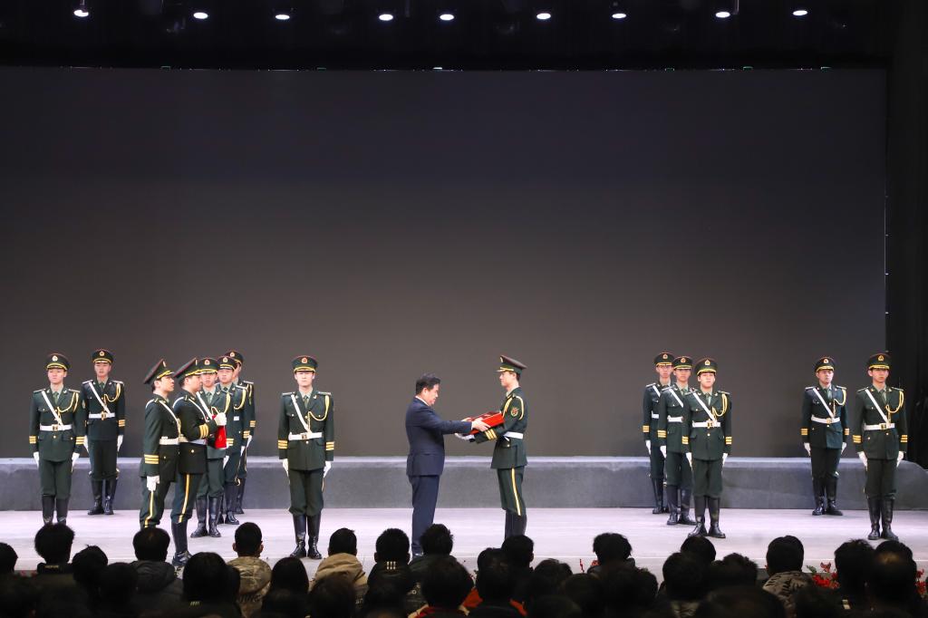 在全体师生的瞩目下,狄生奎将天安门地区管委会赠予的编号为“2024—0128”的国旗和证书郑重递交给国旗班成员。国旗班成员迈着整齐有力的步伐,在现场庄重地展示了这面2024年5月7日在天安门广场升起的国旗(66年前的5月7日,原铁道部下发文件成立兰州铁道学院)。鲜艳的五星红旗辉映会堂,全体与会人员起立,齐唱国歌,歌声雄壮,催人奋进。