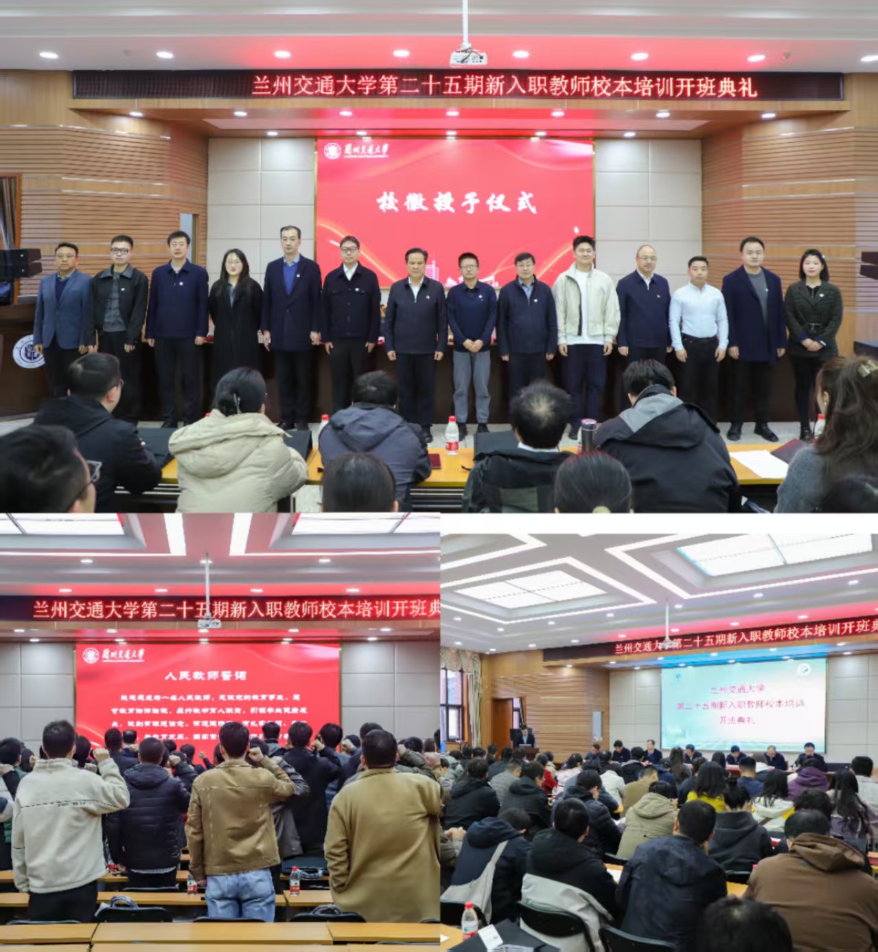交通运输学院刘洋代表青年教师发言。他表达了对学校提供实现人生理想平台的感激之情,将会珍惜宝贵的学习机会,尽快站稳讲台,快速融入兰州交大这个大家庭,为学校高水平大学建设贡献自己的青春力量。全体青年教师进行了人民教师誓词宣誓,校领导及职能部门负责人为青年教师代表佩戴学校校徽,这一庄严的仪式不仅是对教师身份的庄严确认,更是对教育初心的深刻唤醒,也激励着青年教师在今后的教学科研工作中,始终以学生为中心,以育人为根本,以创新为动力,努力成长为新时代德才兼备的“大先生”。