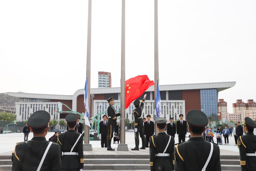 入场仪式结束后,全体师生肃立,面向国旗,奏唱国歌,注视着五星红旗在运动场上空冉冉升起。