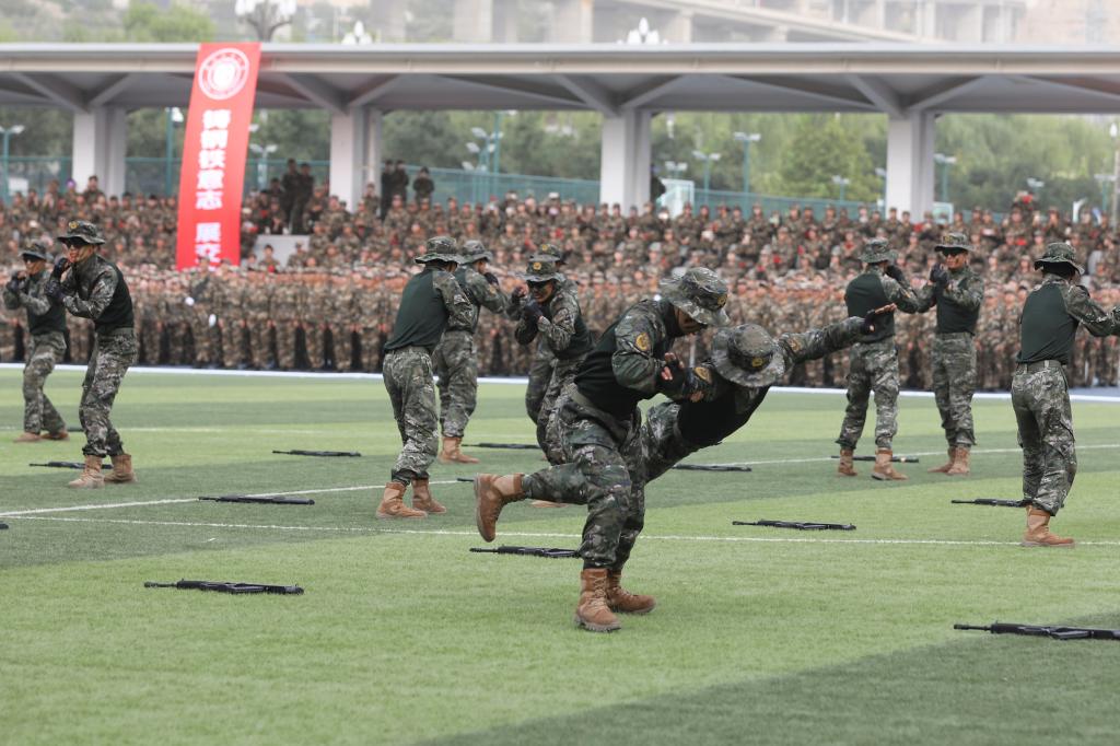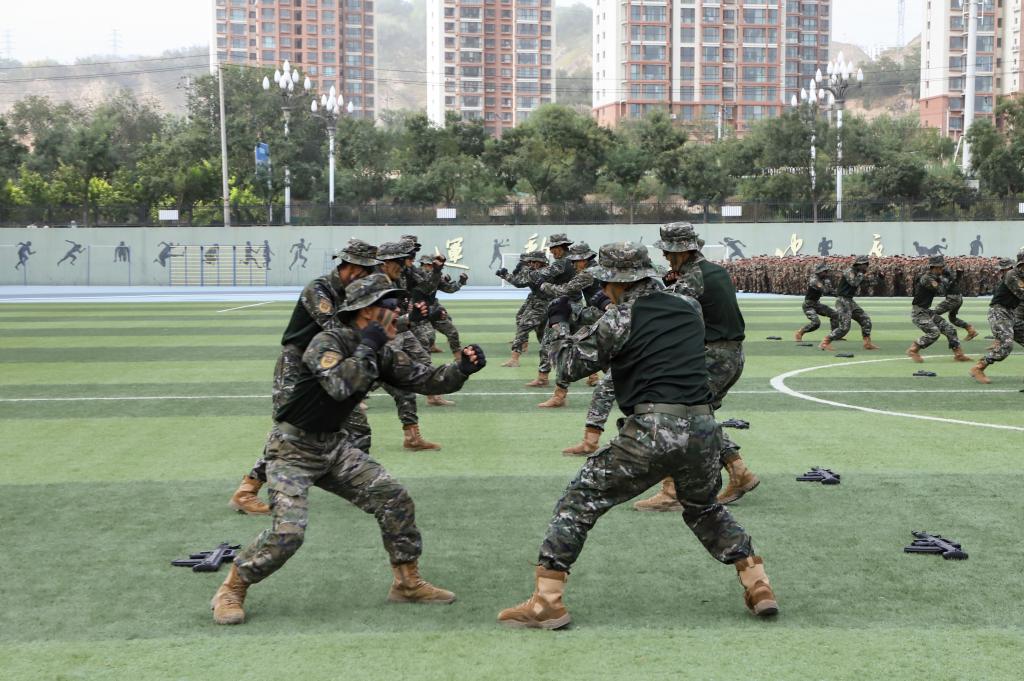在特色科目汇报表演环节,男子擒敌拳方阵率先登场,拳出如电、腿扫生风,队员们动作刚劲有力、吼声震天,将坚韧不拔的意志融入每一招式,尽显刚毅果敢;女子匕首操方阵紧随其后,银光闪烁间,动作整齐划一、目光如炬,完美诠释了“巾帼不让须眉”的担当与自信;承训教官带来的刺杀操表演则将现场气氛推向高潮。学员们身着戎装,动作刚猛有力、气势如钢铁洪流,杀声震天,尽显军人的铁血本色、严明纪律与威武之师的风范。一招一式干脆利落,一步一踏铿锵有力,引发全场掌声雷动。